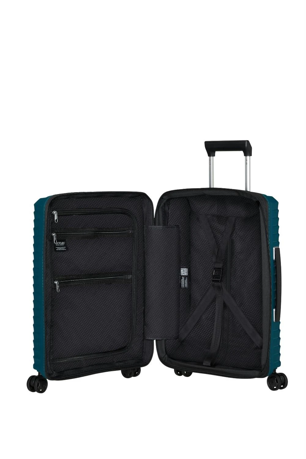 De Samsonite Upscape Spinner 55cm. (143108 1686 Petrol Blue) heeft een hoofdvak met ritssluiting. Deze is expandable waardoor er extra ruimte is te creëren en de inhoud is uit te breiden van 39 naar 45 liter. De koffer is gemaakt van sterk polypropyleen. Dit materiaal is bovendien erg licht in gewicht, slechts 2.3 kg! Het interieur van de koffer is gemaakt van gerecycled PET en heeft een uitneembare en wasbare voering.